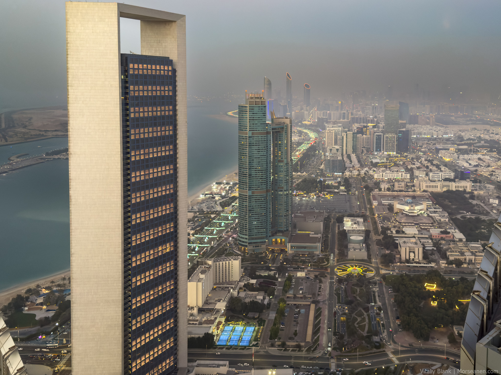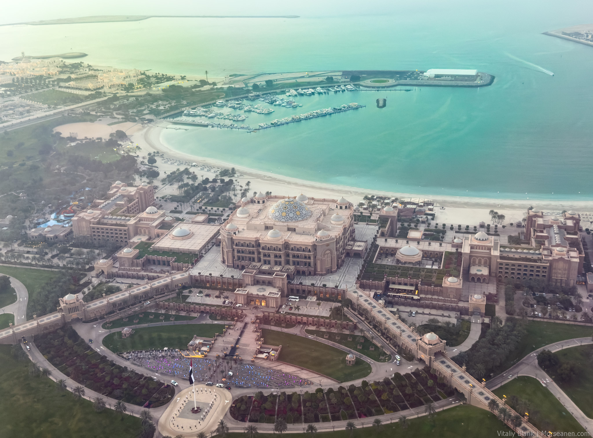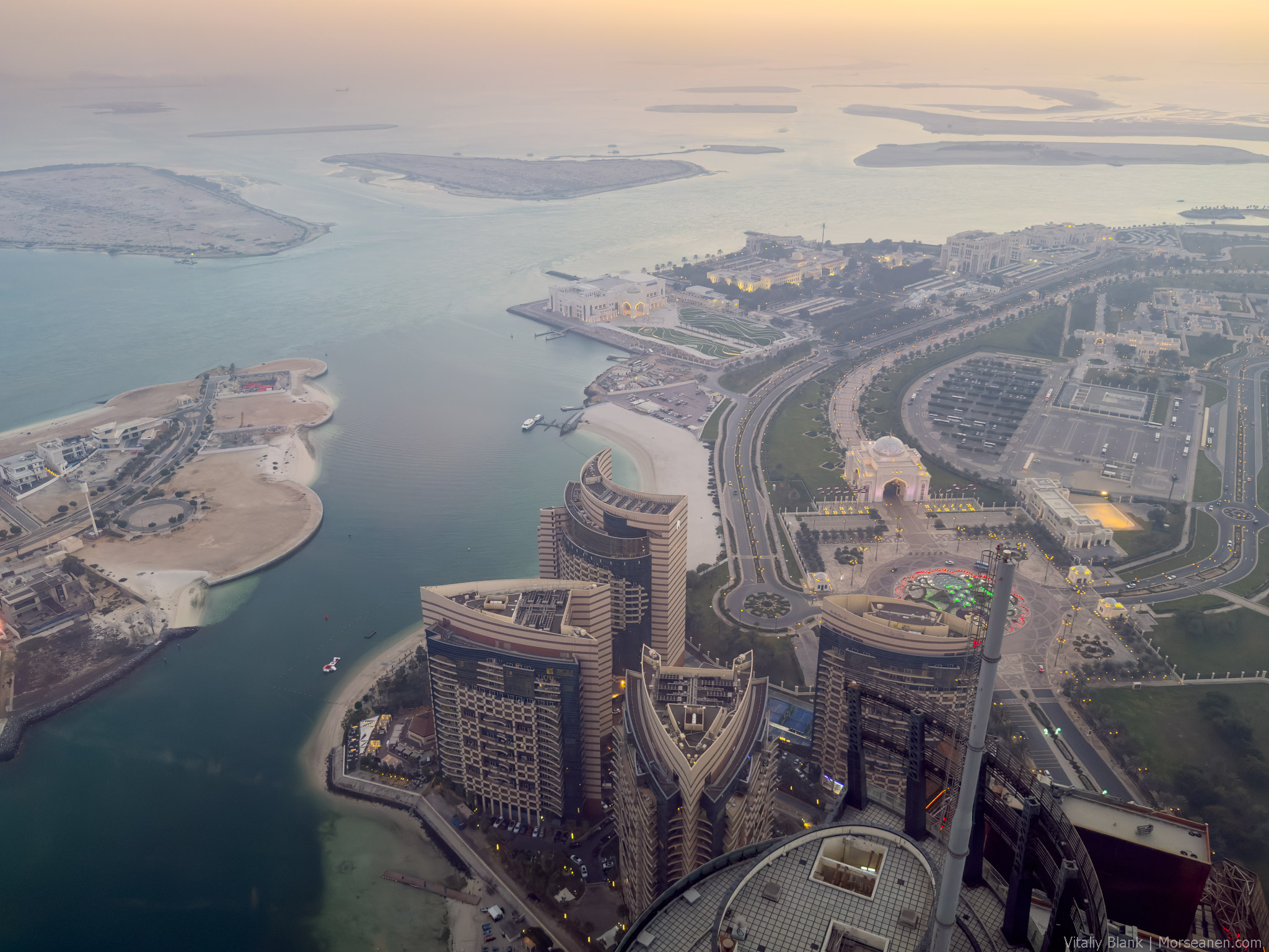 Еще и особенностей отеля — бесплатная для его постояльцев обзорная площадка Observation Deck at 300🔭 на 74-м этаже — лучшая во всем Абу-Даби (хотя я даже не знаю, есть ли в городе вообще другие обзорные площадки?). Вот вам несколько видов на тот самый Emirates Palace, набережную Корниш и насыпные острова.