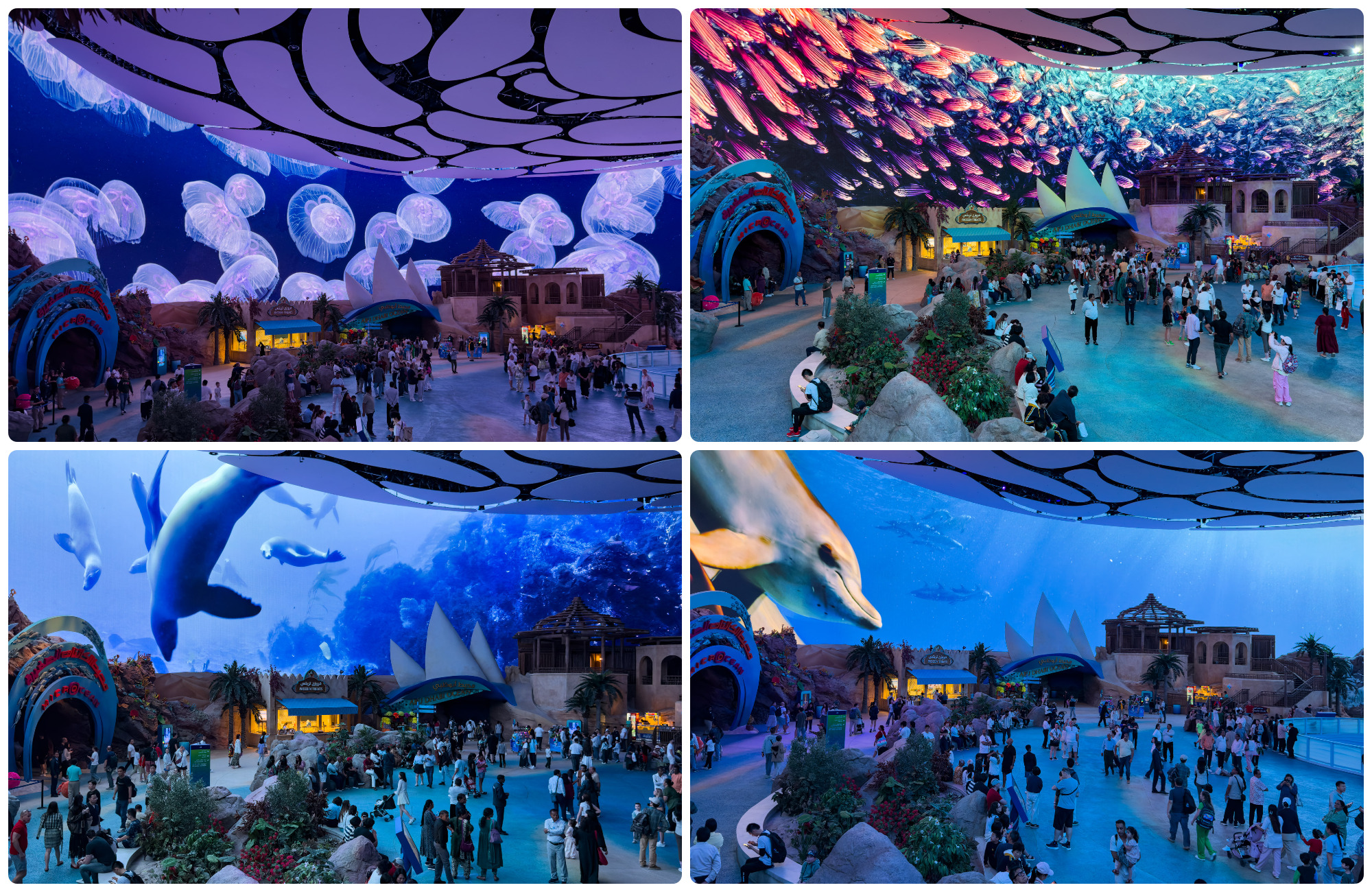 Одно из самых сильных впечатлений от парка — это гигантский экран главного фойе. Можно вообще не ходить по всем этим бассейнам с аквариумами, а просто залипнуть на целый день там.