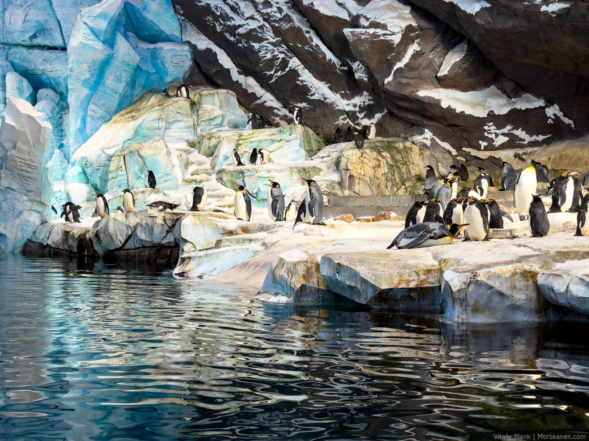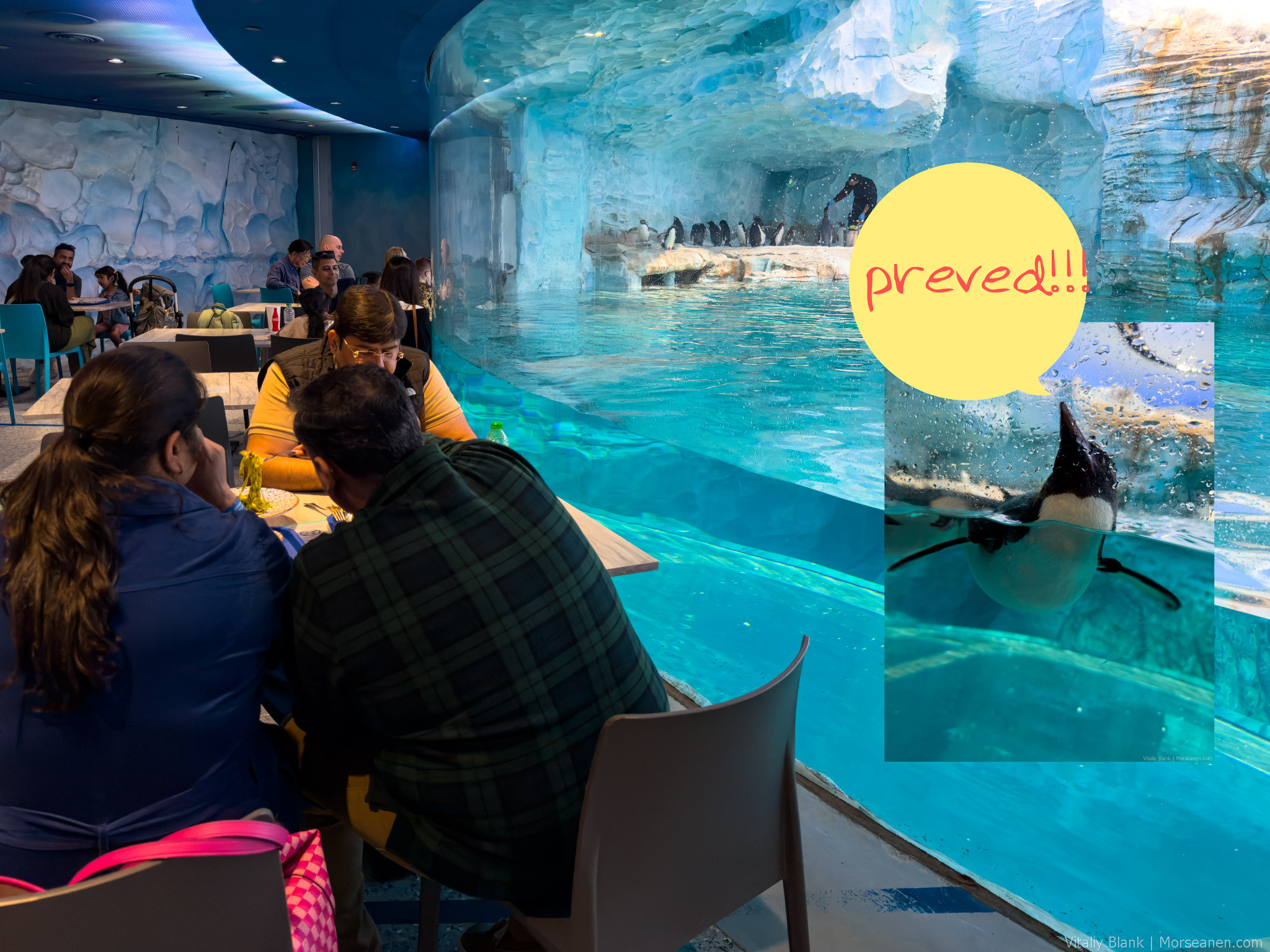 Кафе со столиками, разделенными от бассейна с пингвинами стеклянной стенкой. Можно прямо за бургером отвесить пятюню проплывающему по делам пингвину. Немыслимое для европейских парков погружение.