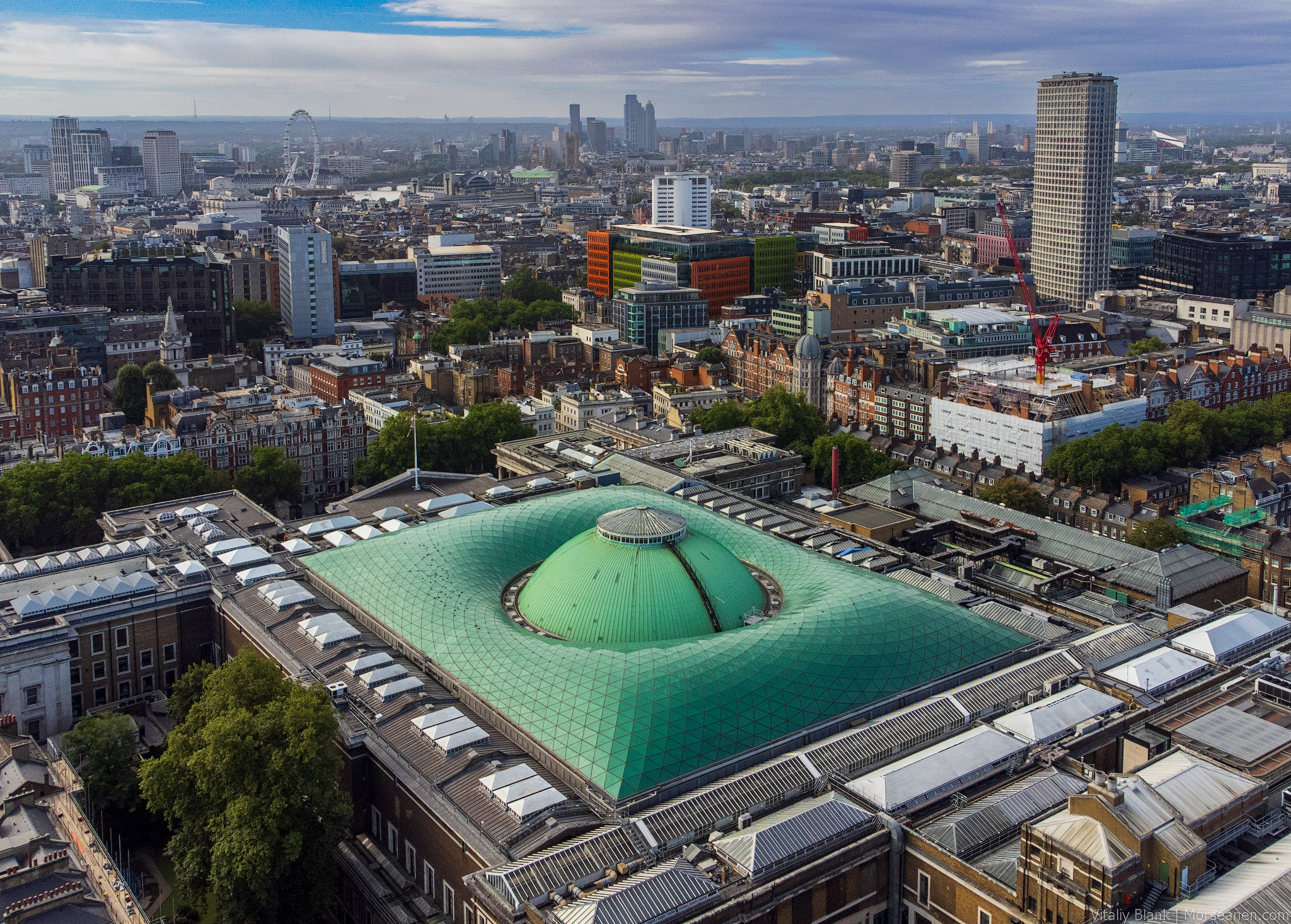 Еще одно формально разрешенное место — Площадь Рассел (Russel Square). Для меня локация вызвала интерес возможностью увидеть сверху крышу Британского Музея (British Museum). Легендарный Норман Фостер установил в 2000-м году над центральным двором роскошную «зефирную» крышу, что позволило строению под стеклянно-стальной конструкцией стать крупнейшей крытой площадкой в Европе.