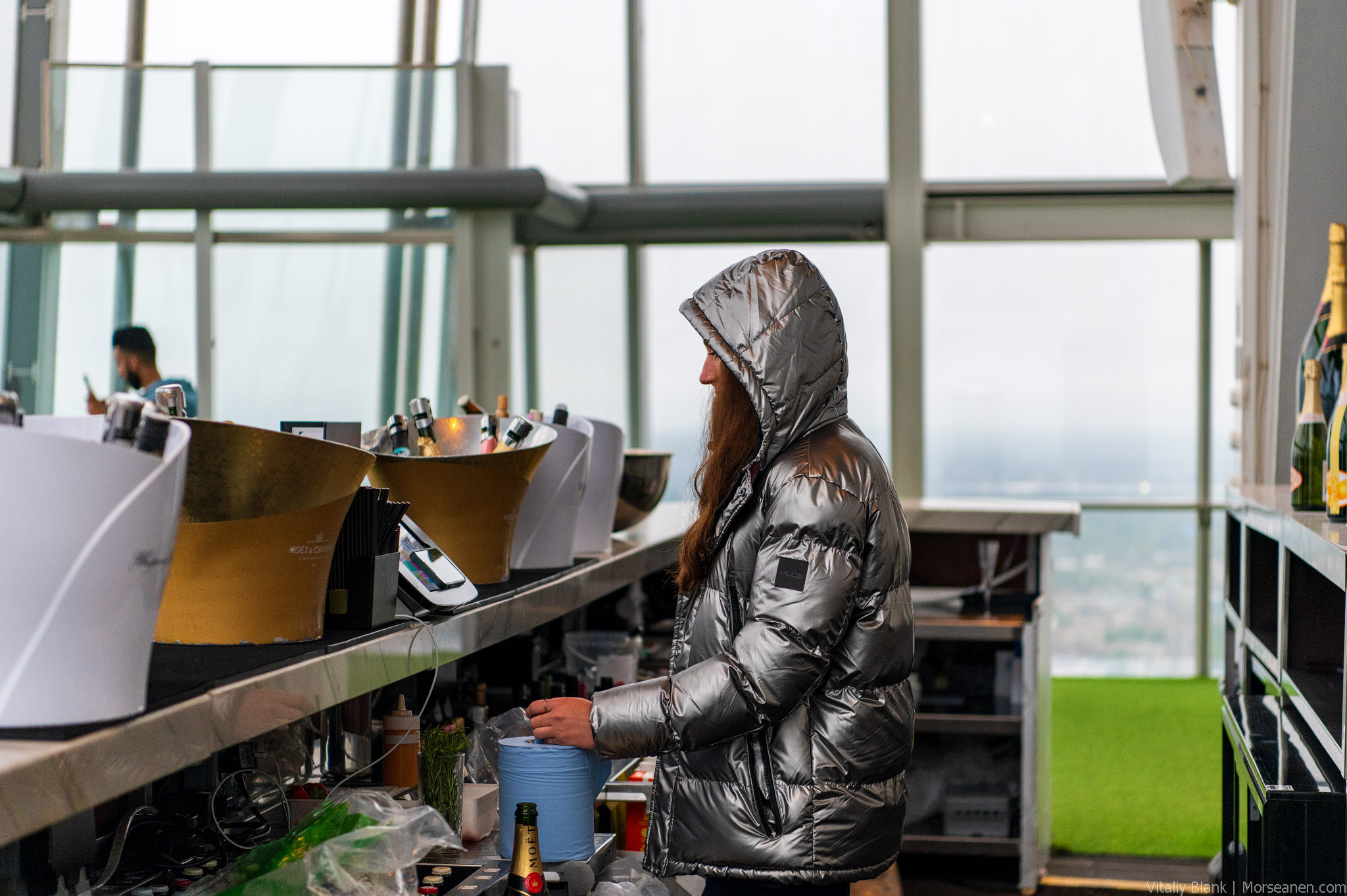 Я забронировал время на закат. Пришел чуть раньше. Думал, посижу, дождусь заката. Но на верхней площадке на 72-м этаже ветер прилично так леденил ноздри🥶. Сбежал от холода на нижнюю площадку, а там сюрприз — сидеть не разрешают — изволь пройти в ресторан за холодным игристым. Пришлось стоять 40 минут☃️.