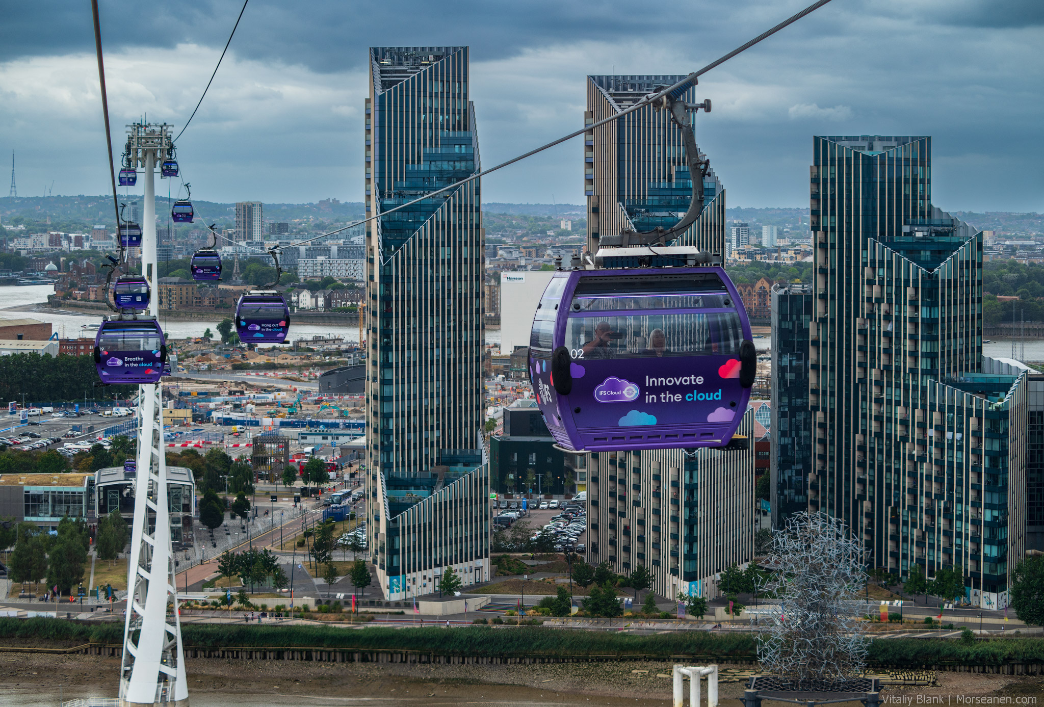 Канатная дорога, пересекающая живописный меандр Темзы от Гринвичского полуострова (Greenwich Peninsula) к району Королевских доков (Royal Docks).