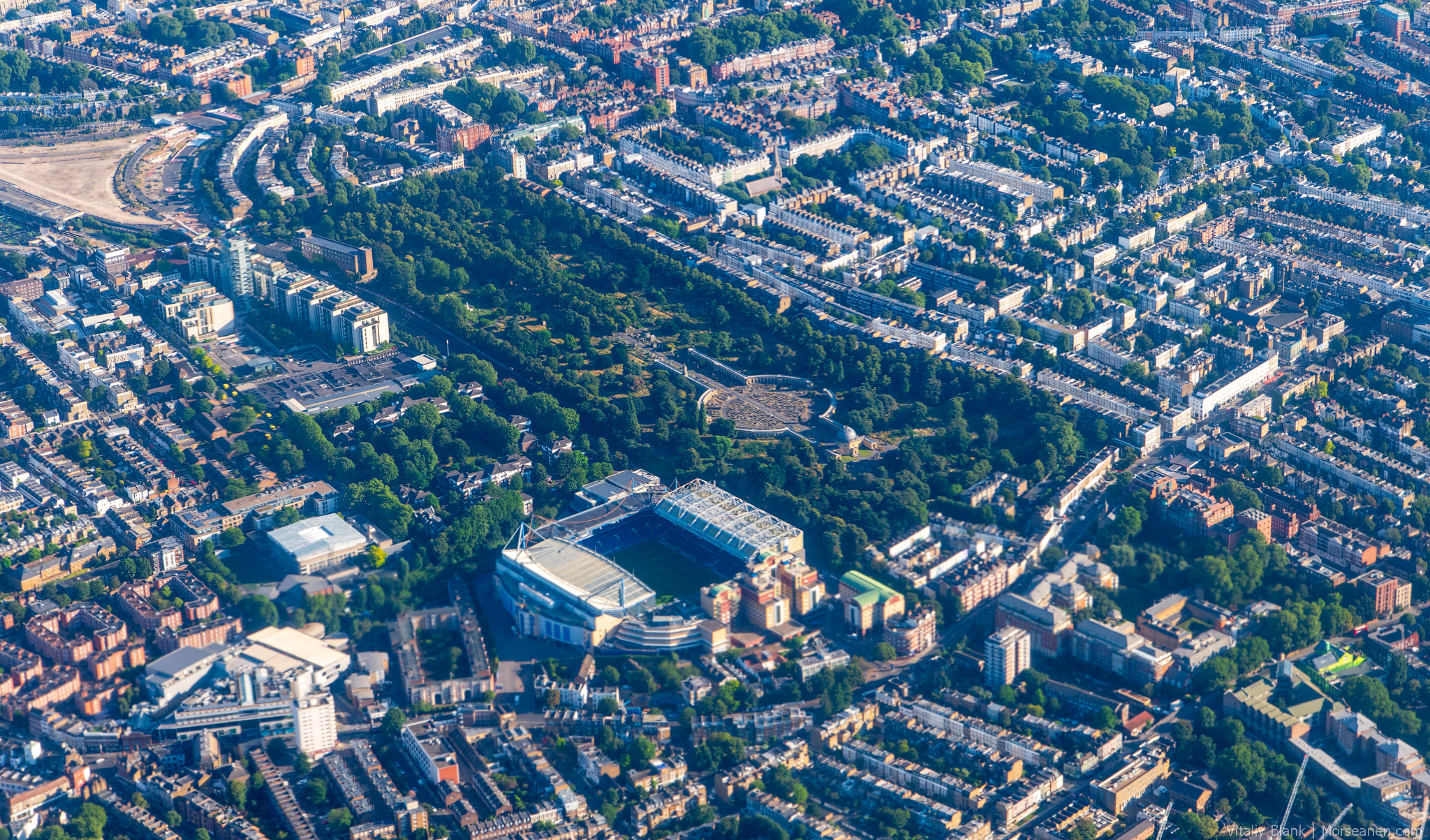 Stamford Bridge — стадион футбольного клуба Челси в одноименном и одном из самых элитных районов Лондона — Chelsea. Сверху видно Бромптонское кладбище.