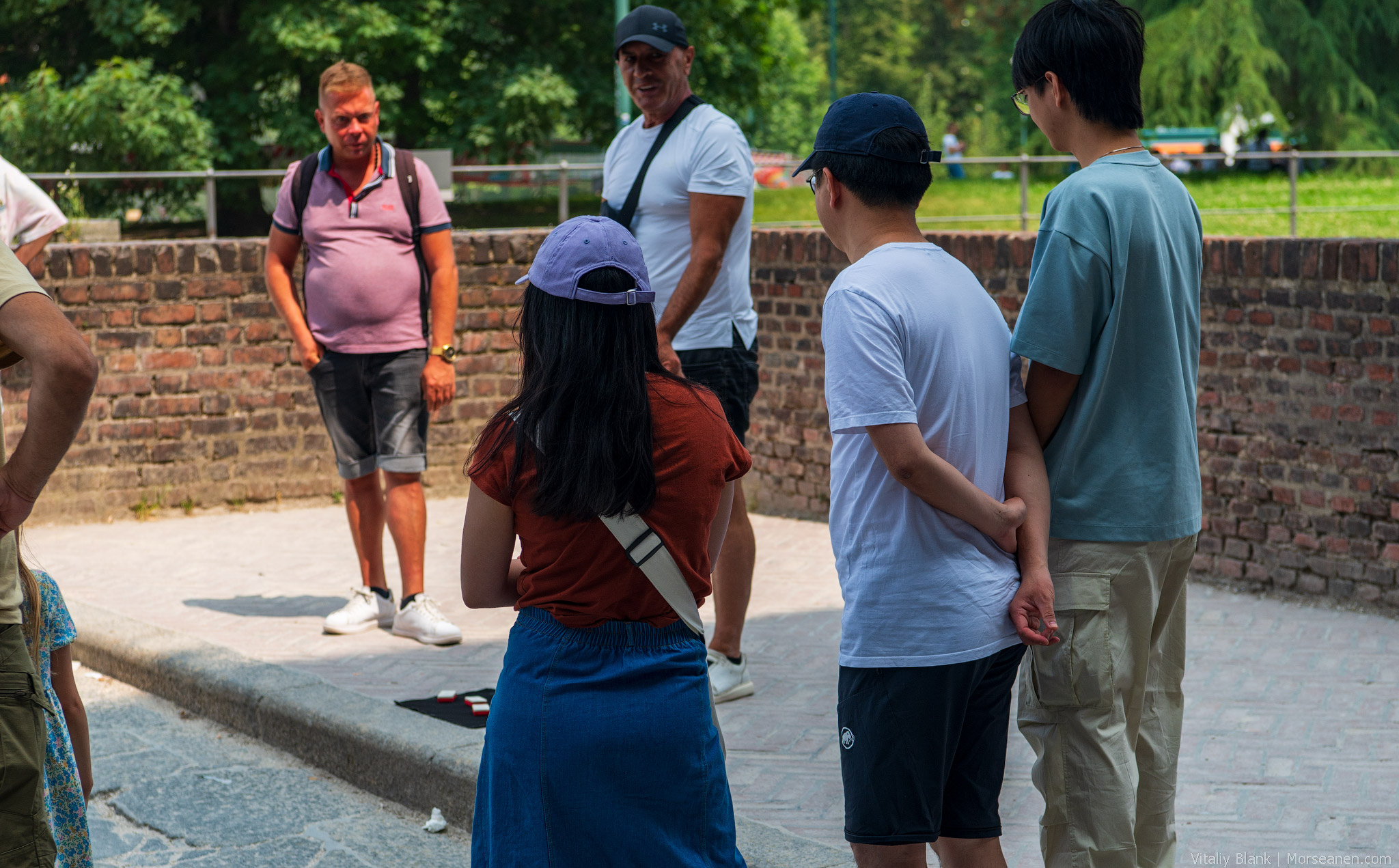 Хотя, ха! Барыги вроде и свалили, но что это тут у нас, блиа, прямо в самом историческом месте? Прямо в сердце, мать ее, крепости Сфорцеско?! Поверить не могу своим глазам! Наперсточник🎲! При всем белом свете растянул свою паутину для лохов! И, главное, все по правилам! По бокам смотрящие👀 за кавалерией. Присутствует в гастролирующей труппе и якобы удачливая мамзель🤑. А китайцы стоят, уши развесили, полтиннички в руках теребят. Бедолаги🎣.